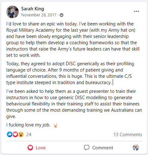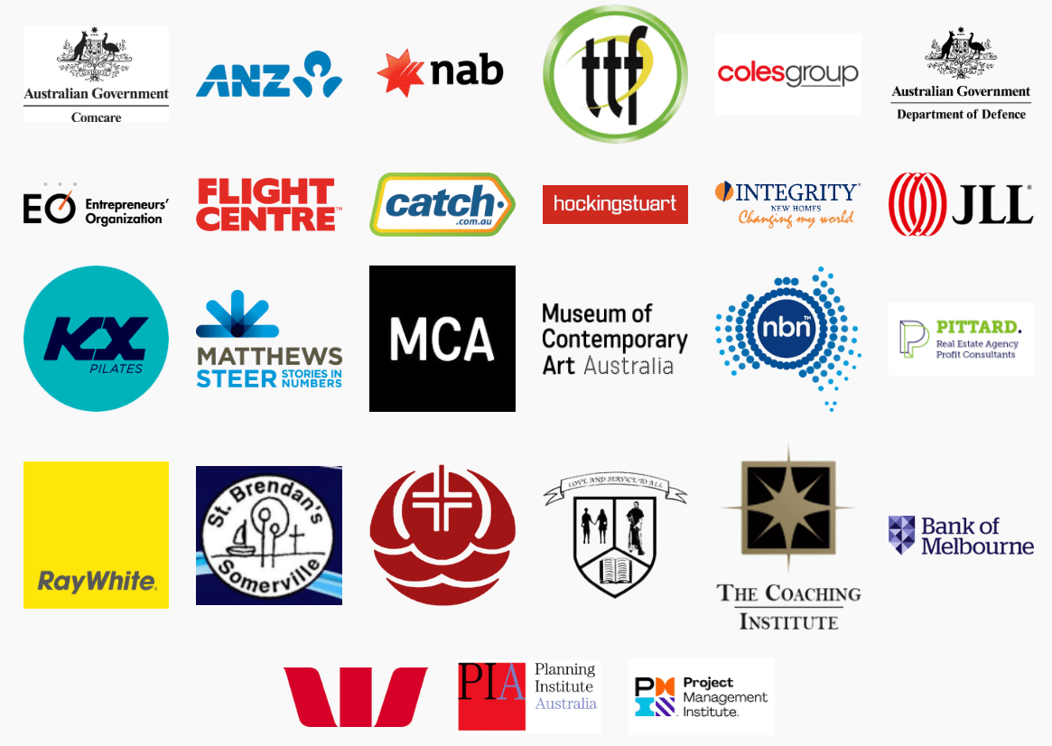 His clients range from multinational corporations to leadership networks and community groups. Organisations he has worked with include Jones Lang LaSalle, Flight Centre, ANZ, Department of Defence, Ray White, The Coaching Institute, Museum of Contemporary Art, Coles Group, NBN, and various education networks.